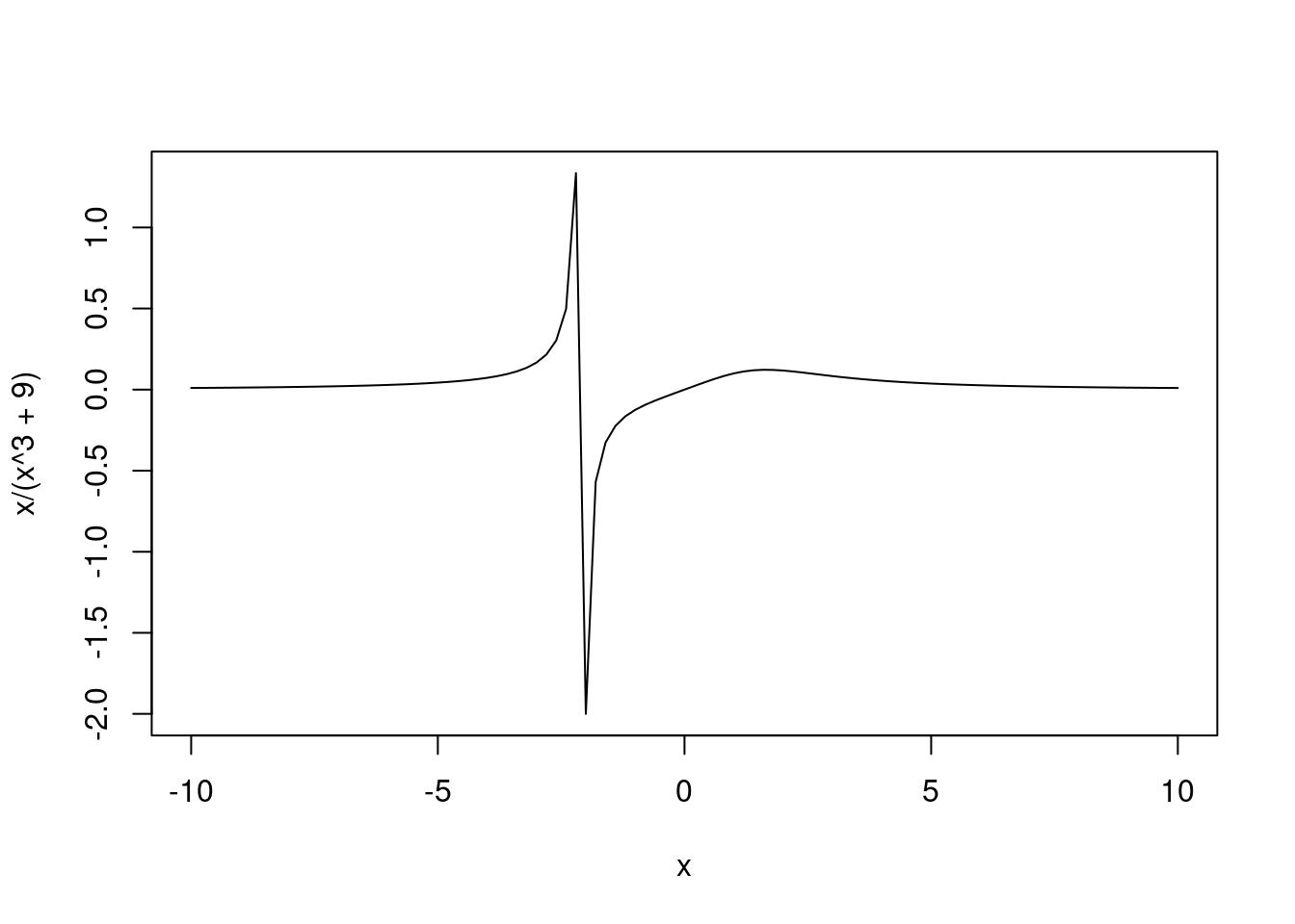 On top of replacing your computer’s calculator, R can replace your graphing calculator as well. Unless you need to tinker with the axes or stop the asymptotes causing you problems – problems that your graphing calculator would give you anyway – functions like curve(x / (x^3 + 9), -10, 10) (output below) do exactly what you would expect and exactly how.